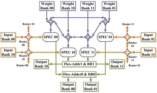 Figure 8. An example of an overall architecture with 2 × 2 SPECs. The RR module contains re-quantization and ReLU units. Four-pointed stars denote routers from [20].