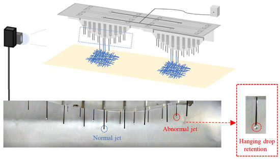 Electrospinning is one of the main methods of preparing ultrafine nanofibrous materials, which have broad applicational prospects in the fields of air filtration [1], polluted water purification [2], the development of medical dressings [3], active food packaging [4], electromagnetic interference shielding [5], and so on. Particularly, in the case of increasingly serious global water pollution, multifunctional oil–water separation nanofiber membranes are used to efficiently purify water resources [6,7,8]. The use of multi-nozzle electrospinning technology is one of the main methods employed to achieve mass electrospinning in industrial applications. Different process parameters [9], such as the spinning voltage and solution concentration, have a great influence on the formation of jets during the stretching of polymer solutions [10,11,12]. Abnormal multi-jet ejection behavior is the principal element impacting the quality and efficiency of nanofiber membrane formation. Therefore, the online monitoring of multi-nozzle electrospinning and the automatic recognition of jet anomalies have become core problems in the mass industrial electrospinning domain.