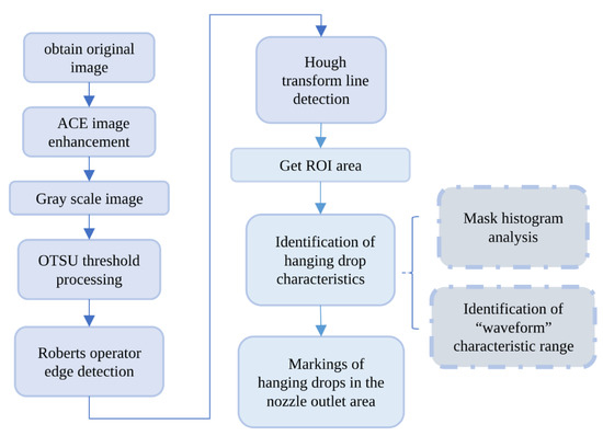 The monitoring of the multi-jet electrospinning process has been transformed into obtaining real-time images recorded by a CMOS camera. Based on image-processing technology, the Regions of Interest (ROI) of the images were established, and the hanging drops of the cone tips were recognized. The processing flow of the multi-jet electrospinning imagesis shown in Figure 2.