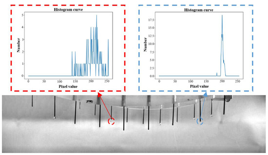 In the nozzle outlet areas of the images, the hanging drops at the spinneret cone tips could be found. Due to the refraction and scattering of light, there are obvious pixel changes in this area, which have an approximately waveform-like shape. The mask histogram analysis of the ROI is shown in Figure 5. In this region with its hanging drops, the pixel changed obviously, and the distribution was scattered. Conversely, when there were no hanging drops in the cone tip area, the background did not fluctuate, and the pixel distribution in the histogram was concentrated.