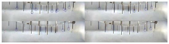 Multiple groups of video-framing outputs were selected to verify the results. The accurate identification rate of hanging droplets at the multi-jet cone tip reached 85%. The specific verification data are shown in Table 1, including the total frames, the total number of multi-jet cone tips, the number of correct frames and error frames, and the accurate identification rate. In addition, as shown in Figure 6, the identification results of different time states in the same group have been displayed. The warning marks of hanging drops in the nozzle outlet area were indicated.