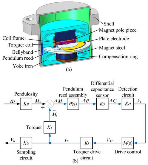 A QFA is mainly composed of a quartz pendulum reed component, differential capacitance sensor, torquer, shell, etc. [22], and its structure is shown in Figure 1a. The quartz pendulum assembly, differential capacitance sensor, torquer, and drive circuit constitute the closed-loop system shown in Figure 1b [23]. The transfer function of the closed-loop system can be expressed as: