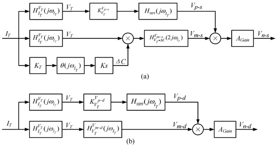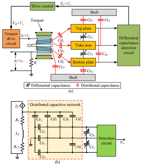 In the QFA, the shell, yoke iron, torquer coil, differential capacitor plate, and other components are made of metal materials. These components are independent of each other and do not make contact with each other. When the accelerometer works, there is a potential difference in electricity between different components, which forms the distributed capacitance shown in Figure 2a. , , and are the distributed capacitances between the torquer coil and the plates of the differential capacitor; is the distributed capacitance between the top and bottom plates of the differential capacitor; , , and are the distributed capacitances between the three plates of differential capacitance and the accelerometer shell; and is the distributed capacitance between the accelerometer shell and the torquer coil.