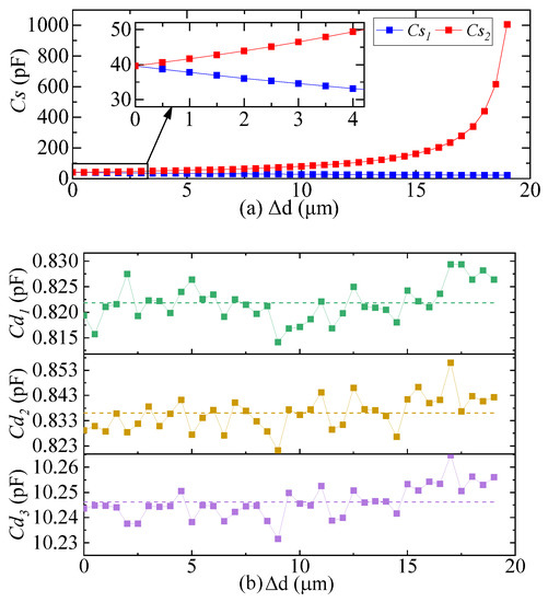 The simulation results of differential capacitance and distributed capacitance are shown in Figure 3. The differential capacitance decreases monotonically and increases monotonically with the increase in pendulum reed displacement. When the movement of the pendulum reed is very small, the decrease in is approximately equal to the increase in , and can be approximately expressed as: