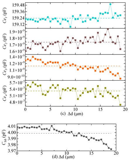 Simulation results of differential capacitance and distributed capacitance. (a) Simulation results of differential capacitance and ; (b) Simulation results of distributed capacitance , , and ; (c) Simulation results of distributed capacitance , , , and ; (d) Simulation results of distributed capacitance .