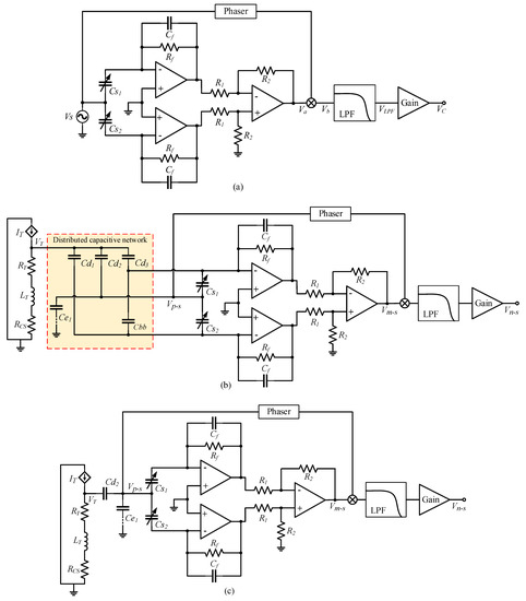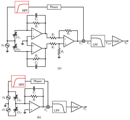 According to the structure of the detection noise transfer system of the two carrier modulation detection circuits, the detection noise is equal to the product of and . In order to truly reduce the detection noise, , , or should be reduced. Increasing the feedback capacitance can reduce , but increasing will increase ; therefore, can only be reduced by reducing . Reducing can not only reduce the gain from the driving current to the detection-noise-transmission process but will also not cause an , , and gain change. According to Figure 4b and Figure 5b, only passes through a phase-shifting circuit before mixing with through the multiplier. Since the carrier signal through the phase-shifting circuit is a high-frequency signal, and pseudo-carrier signal is a low-frequency signal within 300 Hz, the value of can be suppressed by adding a high-pass filter in front of the phase-shifting circuit. The optimized carrier-modulated differential capacitance detection circuit is shown in Figure 14.
