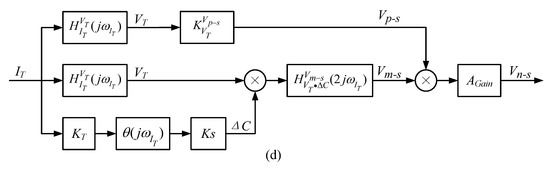 The frequency of and is the same, and the frequency of the mixing output signal is twice that of . The structure of the detection noise transfer system of the DCM detection circuit is shown in Figure 5d. The detection noise of the DCM detection circuit can be expressed as: