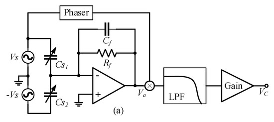 When an SCM detection circuit is used to detect differential capacitance, the structure of the detection circuit is as shown in Figure 4a. The single-channel high-frequency sinusoidal carrier signal is input to the differential capacitance fixed plate, and the signals of the two moving plates pass through the charge amplification circuit and the differential amplification circuit to obtain the modulated signal , whose amplitude reflects the variation in the differential capacitance .
