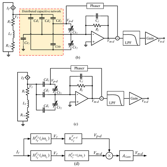 SCM detection circuit and its detection noise transfer path. (a) SCM detection circuit; (b) Detection noise transfer path composed of SCM detection circuit; (c) Simplified path of detection noise transfer formed by SCM detection circuit; (d) Structure of detection noise transfer system in SCM detection circuit.