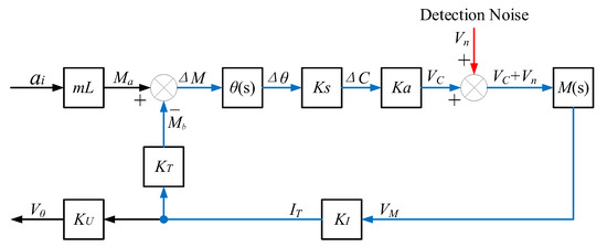 where is the frequency of input acceleration , and is the transfer function between current sampling output and the equivalent acceleration of detection noise, equal to the reciprocal product of sampling circuit transfer function and accelerometer scale factor . represents the transfer relationship between torquer converter drive current and detection noise .