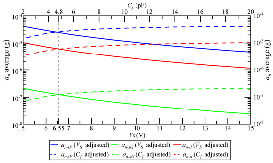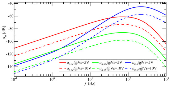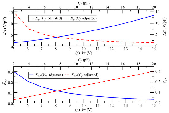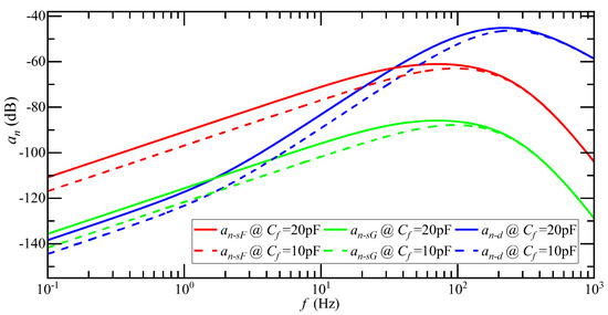 According to Equation (24), the magnitude of the detection noise equivalent acceleration of the DCM detection circuit is determined by , , , and . As in the case of the single-carrier modulation detection circuit, adjusting cannot suppress .