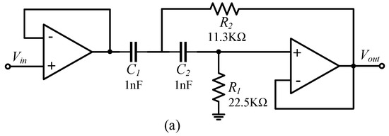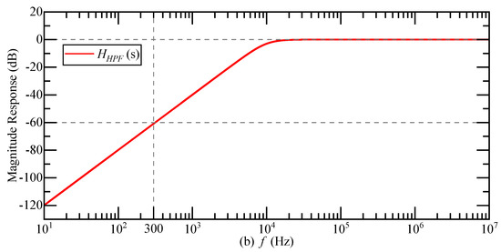 The design of the second-order Butterworth high-pass filter is shown in Figure 15a. The cut-off frequency of the high-pass filter is 10 kHz, the gain is 0 dB, the stopband frequency is 300 Hz, and the stopband attenuation is −60 dB. The transfer function can be expressed as