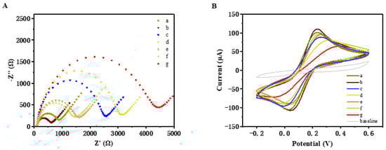 In this study, we used electrochemical devices to characterize the interface properties through the EIS method, which investigated the step-by-step preparation of the biosensor. According to the Nyquist diagram, the curve’s semicircle diameter equals the charge transfer resistance(Ret) [30]. The EIS curves of stepwise modified electrodes are shown in Figure 1A. The results of impedance spectroscopy indicated that the resistance of the GCE electrode after gold electrodeposition (curve b with a value of about 373 Ω and its confidence interval (CI) is (195, 453)), was lower than that of the bare GCE electrode (curve a) value of about 756 Ω, CI (579, 818), indicating that AuNPs were successfully attached to the electrode surface. It showed that AuNPs had good conductivity and can promote electron transfer. Due to the electrostatic repulsion between the negatively charged oligonucleotide phosphate skeleton and [Fe (CN)6]3−/4− in solution, the Ret increased (curve c with a value of about 2354 Ω, CI (1968, 2532)) when HC was immobilized on the modified Au/GCE electrode by Au-S bonding, showing that the immobilization of the HC was successful. After the target DNA combined with the HC on the electrode surface, the Ret increased appropriately (curve d), the value was about 2913 Ω, CI (2858, 3131). Both electrostatic repulsion and the steric hindrance of organic molecules severally hindered charge transfer on the interface. After the reaction of EXO Ⅲ, the Ret decreased apparently (curve e), the value was about 1467 Ω, CI (1468, 1712). In this case, target DNA was hybridized with HC and formed ds DNA. The dsDNA was partially digested with the activation of the cleavage reaction. However, when the probe nanocomposite (Au/SCX6/RGO-MB-LP-AP) was hybridized with the residual HC strands on the electrode surface, inapparently changed Ret (curve f) was obtained and the Ret value was about 1309 Ω (CI (1242, 1442)) due to the high conductivity of AuNPs and RGO. At the same time, it can be observed that when only LP, AP and MB (without Au/SCX6/RGO nanocomposite) were added to be hybridized with residual HC strands on the electrode surface compared with curve e, the semicircle diameter significantly increased (curve g) and the Ret value rose to about 4086 Ω, CI (3832, 4221). This was owing to the obvious steric hindrance and electrostatic repulsion of numerous LP and AP hybridizations. It was also a satisfactory proof of the high conductivity of the nanocomposite. The findings from CV measurements (Figure 1B) were in excellent agreement with the Nyquist diagrams, which showed that the redox peak changed according to the gradual modification process. Both the Nyquist diagrams and CV results indicated that the proposed biosensing platform was successfully constructed as shown in the schematic diagram.