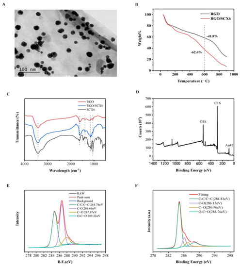 Characterization of nanocomposites (A) TEM image of Au/SCX6/RGO. (B) TGA curves of RGO and RGO/SCX6. (C) FT-IR spectra of RGO, SCX6, and RGO/SCX6. (D) XPS pattens of Au/SCX6/RGO. (E) XPS patterns of C1s in RGO. (F) XPS pattens of Au/SCX6/RGO.