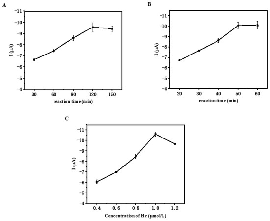 In this study, some experimental parameters were optimized to obtain the best analytical performance of the fabricated biosensor. As shown in Figure 3A, the peak currents increased gradually as the DNA strand incubation time increased from 30 min to 2 h. The peak current reached a stable plateau about −9.56 μA at 2 h, indicating that the incubation between DNA strands increased the MB current dramatically, while the peak currents changed slightly over 2 h. According to the current response, 2 h was employed as the optimal incubation time. The peak currents were dependent on residual HC strands which were not only correlated with the incubation time to form the double stranded DNA, but also related to the cleavage reaction of EXO III. Considering the high cost, 1 U/μL EXO III was used in the assay, and its cleavage time was optimized. As shown in Figure 3B, the peak currents were positively correlated with the reaction time of EXO III. The peak currents increased gradually within 50 min and then kept steady status. The maximum electrical signal of −10.06 μA was observed when the cleavage time reached 50 min. Therefore, 50 min was used as the optimal EXO Ⅲ incubation time. In addition, the amount of hairpin capture probe also plays a key role in the biosensor. With the increase in HC concentration (ranging from 0.2 to 1.2 μM), the peak currents of the biosensor increased as demonstrated in Figure 3C. When the concentration of HC reached 1 μM, the peak currents decreased slightly, which indicated that the high concentration of HC reduced the hybridization efficiency of nucleic acids due to the steric hindrance effect between nucleic acids. Therefore, the optimal reaction concentration of HC was 1 μM.