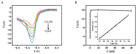 Under the optimal experimental conditions, the detection of different concentrations of target DNA were investigated by DPV measurements to obtain the best analytical performance of the constructed biosensing platform. The response signals upon target DNA concentrations in the 0–100 pM range are shown in Figure 3A. According to Figure 3A, the DPV peaks were increased with the increase in CYP2C19*2 gene concentration. In the concentration range of 0.01 fM to 100 pM, the linear relationship between the peak current and the logarithm concentrations of the target DNA was plotted (Figure 4B). The regression equation obtained from this curve was Y = −1.31logC − 27.67, R2 = 0.99 (C is the CYP2C19*2 gene concentration and R2 is regression coefficient). The calculated limit of detection (LOD) was obtained as low as 13.49 aM (S/N = 3), S and N represent the standard deviation of the blank and the slope of the calibration plot, respectively. The comparison between this biosensor and other existing methods for CYP2C9*2 gene detection are shown in Table S2, demonstrating that the biosensor established in this study has the lowest detection limit. As a result, this biosensor could be used for CYP2C9*2 gene detection with excellent electrochemical properties.