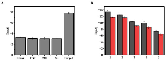 To verify the selectivity of the constructed biosensor, the DPV current responses generated from the same concentration of interfering substances with different mismatched bases were recorded to compare with target DNA. Under the same experimental conditions, 1 fM target DNA was replaced with single-base mismatch target(1-MT), double-base mismatch target(2-MT), non-complementary DNA(NC) and blank solution (each 1 pM), respectively. The results are displayed in Figure 5A. We found that the blank current peak was about −3.24 µA due to the electrostatic adsorption between nucleic acid skeleton and methylene blue. The current of 1-MT, 2-MT and NC were almost identical to blank, even though the target DNA concentration was lower by a factor of 100 times than the concentrations of the interfering substances. The peak currents increased considerably only when the fabricated biosensor was incubated in target DNA, indicating that the designed biosensor had good selectivity. It can effectively discriminate interference with different mismatched bases and could meet the experimental requirements. Under the optimized conditions, the stability of the fabricated biosensor was also verified. Prior to use, the fabricated biosensor was stored at 4 °C and the DPV signals were measured one week later. Figure 5B indicates the comparison of the signals of the five groups of biosensors before and after they were stored for one week. We found that the electrochemical signals were only slightly reduced, the current signal remained at 86.81–92.94% compared with the initial signals, demonstrating that this designed biosensor was coupled with acceptable stability.