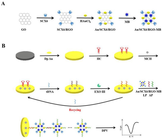 To construct an electrochemical biosensor with high sensitivity, there are two common methods that can be used to improve the analytical performance. One key strategy is to design a new signal amplification mode. Among different electrochemical signal amplification strategies, enzyme assisted technology has gained attention [15]. Various nucleases have been widely used to assist in the recirculation of target [16]. Exonuclease III (EXO III), a common DNA treating tool, possesses a high cleavage activity. Double stranded DNA with a blunt or recessed 3′ end is the best substrate of EXO III. It gradually removes the single nucleotides along the 3′—hydroxyl terminus to the 5′ end of the double stranded DNA [17], which has no cleavage function for dsDNA containing a protruded 3′ end or single stranded DNA (ssDNA) [18]. EXO III–assisted electrical signal amplification has been widely used to develop novel biosensing platforms for nucleic acid detection because there are no special requirements for the sequence of substrates [19]. Graphene has many excellent characteristics including high surface areas, excellent conductivity, high chemical activity, low cost, and holds great potential applications and prospects in many technical fields [20]. Calixarene has an adjustable cavity size with rich and varied conformations, so it demonstrates good selectivity when binding with guest molecules [21]. Calixarene exhibited high supramolecular recognition and enrichment capability, which can form stable host–guest complexes via hydrogen bonding, specific stacking, or electrostatic interactions with various guest molecules [22]. Because of the above advantages, calix[6]arene can enrich the electroactive substance methylene blue (MB) resulting in a sharp increase in the current signal [23]. It has been determined that calixarene and carbon materials can form complexes by π-π interaction and formation of hydrogen bonds [24,25], thus we can synthesize new composites with excellent properties of calixarene and graphene simultaneously. Gold metal nanoparticles (AuNPs) have been extensively used to improve the sensitivity of biosensor due to their good conductivity, chemical stability, strong adsorption capability, and large surface area [26]. However, due to Van der Waals forces and high surface energy, AuNPs are prone to irreversible aggregation in solution. GO material has excellent loading capacity for nanoparticles, and it is a good carrier for dispersing metal nanoparticles. The in situ generated, reduced graphene oxide (RGO) is negatively charged and exhibits high absorption capacity toward positively charged Au. RGO is a good reducing agent for the formation of Au/RGO nanocomposites. In this research, AuNPs were used to load many auxiliary probes based on macrocyclic host SCX6 and RGO, so that the biosensor has supramolecular recognition and enrichment capabilities for MB. It also has good conductivity, and a large specific surface area.