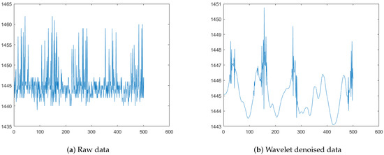 Due to the complexity of human muscle structure and the accuracy of the acquisition equipment itself, the EMG signal is vulnerable to noise in the acquisition process. Noise can be divided into high frequency noise and low frequency noise according to its own frequency band. Low frequency noise includes electrical signals generated by human tissues outside the target muscle group, and high frequency noise includes electromagnetic interference in the experimental site and noise of the equipment itself. The dual-conduction muscle electrical module used in this experiment has a certain hardware filtering function but, in order to ensure the accuracy of the data, this experiment uses algorithm filtering to carry out the secondary processing of the original data. In this paper, the wavelet denoising method is used and wavelet dp5 is used as the fundamental wave to realize signal denoising. Taking the rectus femoris muscle during walking as an example, the signals before and after noise reduction are shown in Figure 3.