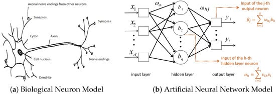 The artificial neural network (Figure 4b) is a data processing model that simulates biological neurons (Figure 4a). It is calculated by a large number of artificial neurons connected with each other and changes its structure according to the external information. The operation process is mainly to adjust the weights between neurons to model the input data and ultimately has the ability to solve practical mathematical problems.