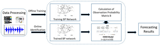 where , . Obviously refers to the probability that the corresponding generated observation state is when time is t and hidden state is . is established by the BP model. The offline BP recognition method is used to calculate the probability that the BP model recognizes the observed when the current hidden state is .