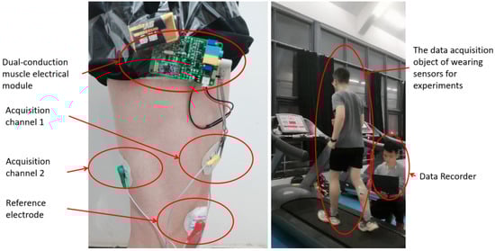 In this study, the EMG signal acquisition of lower limb muscles is realized by the dual-conductance muscle electrical module, as shown in Figure 2. This module includes front-end analog circuit acquisition and back-end digital signal filtering processing. The front-end acquisition circuit collects the muscle electrical signals of the human arm or leg through two channels. After a series of signal amplification and filtering, the analog acquisition signal is output by the output port. The waveform of the muscle electrical signal can be observed directly through the filter. The back end uses a single chip microcomputer for digital filtering and collects the value of muscle electricity for processing to obtain power. Then it is sent to the host computer through Bluetooth 4.0. In the data collection, the testers are required to run at the speeds of 3, 4, 5, 6, 7, 8 and 9 km/h on the treadmill in this experiment. Compared with the complexity of the open-air environment, the indoor treadmill can effectively ensure that the tester can complete the data acquisition at a stable speed and change the speed of the treadmill instantaneously, so that the tester can change the running speed in a short time. At this time, the signal collected by the sensor is the signal with the tester’s speed changing. All the above signals will be stored as original data.