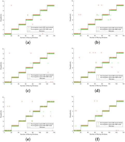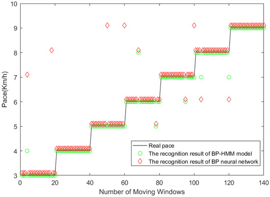 (3) Due to the physiological structure of the human body, under normal circumstances, the pace of the human body changes to a stable change, which means the large probability of the pace at a certain moment does not change at the next moment or changes to a certain pace of its adjacent state. Therefore, this paper incorporates this feature into the model and successfully solves the problem of the large identification error of the BP neural network at different step speed transition moments, as shown in Figure 10. At the time of pace change, the BP-HMM model does not misidentify the samples.