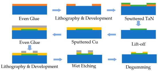 - The TaN film was deposited by magnetron sputtering, and the photoresist and the film material on it were peeled off with reagents, leaving only the designed film pattern on the substrate;