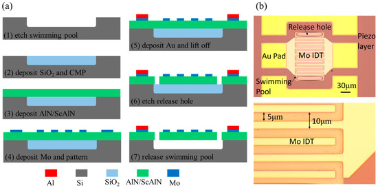 - Konno, A.; Sumisaka, M.; Teshigahara, A.; Kano, K.; Hashimo, K.-y.; Hirano, H.; Esachi, M.; Kadota, M.; Tanaka, S. ScAlN Lamb wave resonator in GHz range released by XeF 2 etching. In Proceedings of the 2013 IEEE International Ultrasonics Symposium (IUS), Prague, Czech Republic, 21–25 July 2013; pp. 1378–1381. [Google Scholar]
