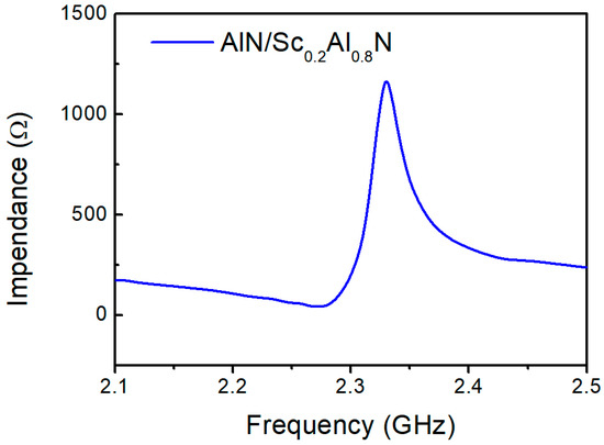 - Park, M.; Ansari, A. Epitaxial Al0.77Sc0.23N SAW and Lamb wave resonators. In Proceedings of the IEEE 2020 Joint Conference of the IEEE International Frequency Control Symposium and International Symposium on Applications of Ferroelectrics (IFCS-ISAF), Keystone, CO, USA, 19–23 July 2020; pp. 1–3. [Google Scholar]