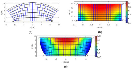 In the following, we use the CTO for designing the desired flat lens at the operating frequency of 15 GHz. The design procedure for the proposed flat lens is depicted in Figure 1. It can be seen that the virtual and physical spaces are represented as (u, v) and (x, y). We consider an intermediate space to map virtual to physical spaces, shown with (ζ, η) in Figure 1b. In the virtual space shown in Figure 1a, CD is an arc of a circle, and sides AD and BC align with the circle’s radius, yielding: AB = 20 cm, arc length CD = 30 cm, C = D = 90°, and A = B = 124°. The intermediate space is a rectangle with a length A″B″ = 1 cm and a width proportional to the design conformal module. The virtual space is mapped to physical space shown in Figure 1c with specifications A′B′ = 20 cm, C′D′ = 26 cm, A′ = B′ = 127°, and A′D′ = 9.25 cm. The lateral boundaries are curved rather than straight lines, such that the D′ = C′ = 90°.