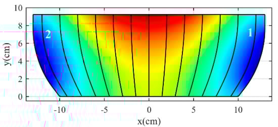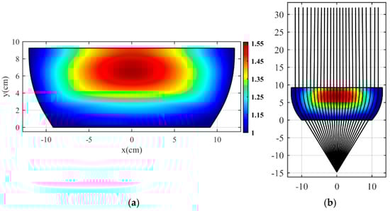 If we apply the dS/du to the whole physical space, we obtain the refractive index n′(x, y) seen in Figure 4a. Note that applying this function requires having the optical path for all physical space coordinates. To gather this information, we first use the ray tracing method to obtain the coordinates of 1100 rays and then interpolate in physical space to determine the refractive index for these coordinates. In this case, we place the source point at a distance of −14.75 cm from the physical space and consider the coordinates of ray trajectories inside the structure. Eventually, we compute the optical path numerically for all points using (7). Moreover, the selected ray for applying the optical path rescaling method does not have the lowest refractive index value. Consequently, the distance between the selected ray and the side boundary has a sub-unity refractive index, which covers a small part of the lens’s sides and does not affect its performance. As such, we remove these sections. Figure 4a indicates that all refractive index values less than one have disappeared, and the lower boundary of the designed flat lens matches to free space. Figure 4b confirms the proper performance of the proposed flat lens by showing the ray trajectories in the COMSOL ray tracing module. As shown in Figure 4b, the source point is placed at a distance of −14.75 cm from the designed flat lens.