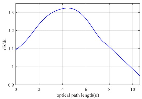 where n and u denote the refractive index and optical path length as a function of ray length, respectively. A is the point of the ray’s intersection with the upper boundary of the flat lens (C′D′), where we consider the optical path zero. Furthermore, Equation (7) can be rewritten as . We can consider an increasing function, such as S(u), and assume that S(u) measures the optical path rather than u. Thus, the refractive index, known as the rescaled refractive index (n′), is determined as