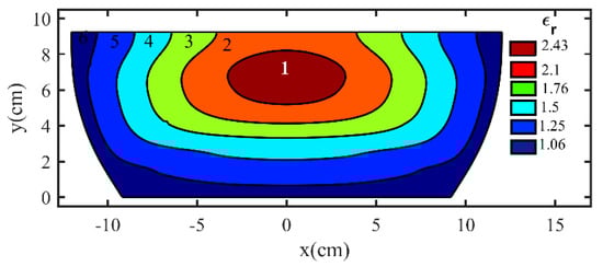 The designed flat lens profile consisting of 6 layers with the permittivity value in each layer.