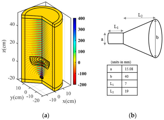A conical horn connected to a standard Ku-band circular waveguide makes the feed antenna. The waveguide’s diameter and length are a = 15.08 mm and L1 = 7 mm, respectively. Moreover, the diameter and length of the horn are b = 40 mm and L2 = 19 mm. The feed antenna dimensions are shown in Figure 6b.