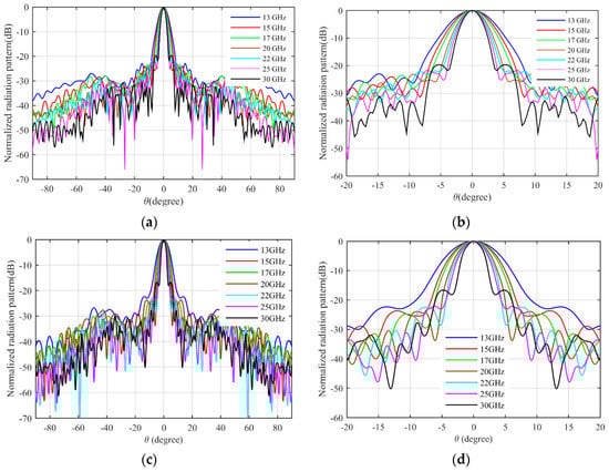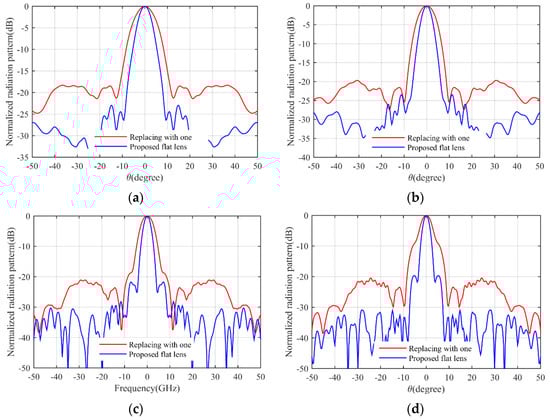 Comparison of the lens radiation pattern in different frequencies with the radiation pattern of the proposed flat lens, (a) 13 GHz, (b) 17 GHz, (c) 25 GHz, and (d) 30 GHz.