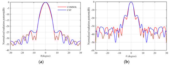 Comparison of COMSOL and CST radiation pattern simulations, (a) 15 GHz, and (b) 30 GHz.