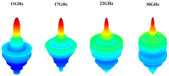 The simulation results are obtained by COMSOL Multiphysics. Figure 7a shows the S11 parameter of the feeding horn while illuminating the flat lens, as shown in Figure 6a. It can be seen that the S11 value is less than −15 dB in the frequency range of 13–30 GHz, which shows low reflection from the proposed lens. Figure 7b presents the aperture efficiency of the proposed lens, which indicates good aperture efficiency from 62% to 74%. Figure 8a,b shows the simulated normalized radiation pattern by COMSOL at frequencies of 13–30 GHz. The half-power beam width (HPBW) changes from 5.6° to 2.7° when the frequency increases from 13 to 30 GHz. To confirm the simulation results, we simulated the proposed lens with CST Studio software, and the radiation patterns are demonstrated in Figure 8c,d. The radiation pattern results of COMSOL and CST are compared at f = 15 GHz and f = 30 GHz in Figure 9. The comparison of COMSOL and CST results shows a good agreement between them, which proves the validity of the results. Furthermore, to demonstrate the radiation performance, 3D radiation patterns are shown in Figure 10. The COMSOL and CST results for the side lobe level versus frequency are depicted in Figure 11a. As shown, the side lobe level is less than −16.5 dB in all of the frequency ranges, which indicates good radiation performance of the structure. Figure 11b shows the COMSOL and CST results for the gain of the proposed flat lens, which indicates an increase in gain with increasing frequency, as expected. Finally, the suggested flat lens antenna can be realized by six milled dielectric layers with different accessible permittivity [34].