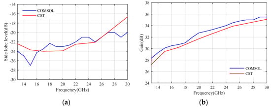 Comparison of COMSOL and CST Simulated results, (a) the side lobe level, and (b) the gain.