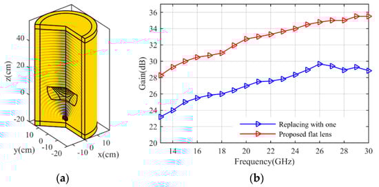 (a) 3D structure of the lens antenna, and (b) comparison of the lens gain with proposed flat lens gain.