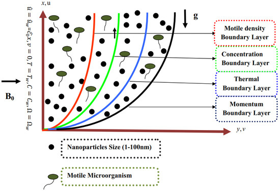 We considered an incompressible flow of mixed convective Prandtl flow of a nanofluid in the influence of activation-energy-containing microorganisms past a stretching sheet. The velocity component was described by and in the direction of the x and y-axis, where the x-axis and y-axis were taken along the surface. Moreover, a magnetic field was implemented on the stretching sheet, as seen in Figure 1.