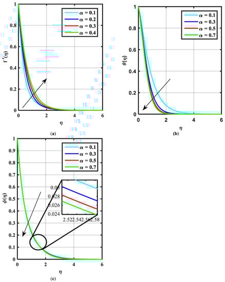 - For escalating values of and the fluid velocity rises while the field of temperature and nanoparticle concentration declines.