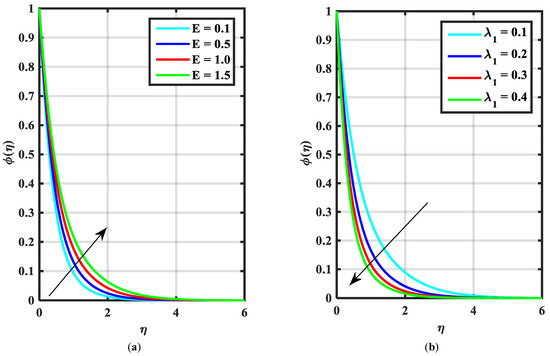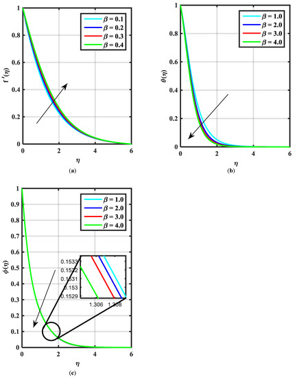 Figure 2a–c express an outcome of the Prandtl variable over and , respectively. The Prandtl fluid parameters were studied for the shear-thinning nature of the fluid. Figure 2a explains the enhancing performance of fluid parameters on velocity . Physically, the fluid turns less viscous when Prandtl fluid parameter upsurges. Thus, the velocity increases for a less-viscous fluid. Figure 2b,c reveal the impact of on and profiles, respectively. The thermal layer and concentration of nanoparticles show the reducing behavior as bigger values of . An impact of elastic parameter over velocity , temperature and concentration are seen in Figure 3a–c, respectively. Figure 3a exhibits that the velocity field enhances with the enhancing values of . Physically, the augment of elastic dynamic viscosity results tends to resist the motion. Figure 3b,c disclose the diminishing of temperature and concentration for the greater values of . Figure 4a–c view the impact of the magnetic parameter on and . Figure 4a reveals that the enhancing value of reduces the velocity profile. Physically, a higher Lorentz force (resistive force) is produced when increases. This resistant force converts some thermal energy into heat energy. Figure 4b,c notice that the temperature profile and concentration tend to increase for the greater values of . Figure 5a,b manifest the influence of on and . From the figure, it can be seen that the improved magnitude of accelerates the velocity distribution. In fact, an increase in produces a larger buoyancy force due to this augmentation in the velocity of the fluid. However, the opposite trend was noted for the temperatre profile in Figure 5b. Figure 6a,b present the influence of and chemical reaction constant over . Figure 6a presents the increasing effect of activation energy on the concentration of the nanoparticle. Physically, the binary chemical reaction slows down when it receives greater activation energy and a lesser temperature. Figure 6b indicates the decreasing impact of by growing values of . Physically, the increase in the extermination process helps the liquid species dissolve effortlessly; thus, the concentration of nanoparticles decreases. Figure 7a,b amount the outcomes of over the and . For greater the temperature field escalates whereas the concentration decreases for larger . Physically, the collision between the fluid particles upsurges with the growth in which intensifies the temperature. Nanoparticle concentration is decayed for the greater values of , as seen in Figure 7b. Figure 8a,b exhibits the growing performance of temperature field and concentration . When rises, the particles of fluid transfer from hotter to cooler surfaces more rapidly which results in the rising heat and mass transfer. The influences of the Prandtl number and Schmidt number on and are viewed in Figure 9a,b, respectively. We detected that and boundary layer viscosity dropped for bigger . Physically, thermal diffusivity decreases with higher . Therefore, the temperature of the fluid declines for larger . From Figure 9b, it is clear that an escalation of reduces nanoparticle concentration. This is because mass diffusivity decreases for larger values of . Therefore, nanoparticle concentration declines for bigger . Figure 10a–c reveal a decline in the thickness of the boundary layer of the motile density profile for mounting amounts of motile microorganism parameter , Lewis number and Peclet number