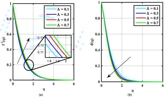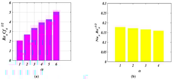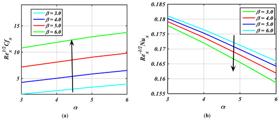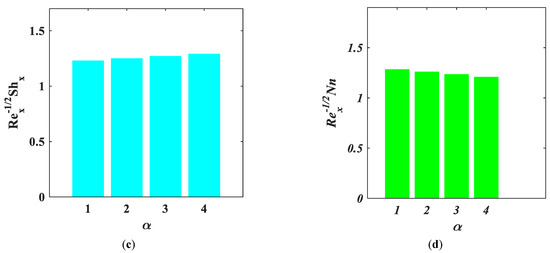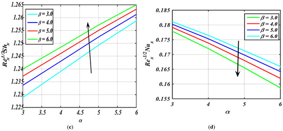The influence of over and versus fluid parameter is portrayed via Figure 11a–d. Figure 11a,c show the increasing behavior of and with the greater values of . Figure 11b,d depict that and are the reducing function of .