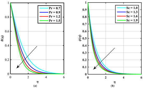 (a,b) Influence of over Prandtl number and over Schmidt number .