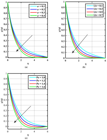 (a–c) Influence of over bioconvection parameter , Lewis number Lb, and Peclet number .