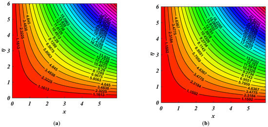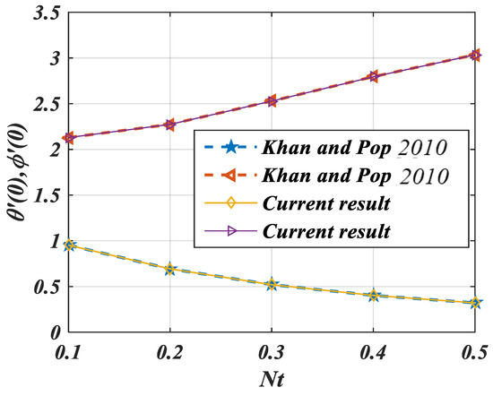 In the end, the contour patterns for = 1.5 and are seen in Figure 13a,b. These figures present the stream pattern of the fluid flow at distinct values of parameters and . Figure 14 shows the comparisons of Khan et al. [5] and the current result.