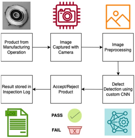 With the rise in modern manufacturing systems and the development of highly complex products, quality management has taken an essential role in organizational planning and strategies []. Quality Control (QC) is a process that involves setting quality standards, ensuring that the product meets those standards, and improving the overall product quality. Quality Inspection is a part of the QC process in which the product is inspected by operators during the various stages of manufacturing. Figure 1 depicts the QC process from the perspective of health monitoring, which involves product inspection. The overall QC process is continuously changing due to the dynamic nature of the manufacturing environment. Approaches such as Design of Experiments (DoE), Failure Mode and Effects Analysis (FMEA), Quality Function Deployment (QFD) and Acceptance Sampling prescribe their own methodologies for product inspection. While these approaches have been very successful in QC, there is an opportunity to assess 100% of the products on the modern shop floor. Continuous assessment of product quality has become a reality with developments in sensor networks and AI.