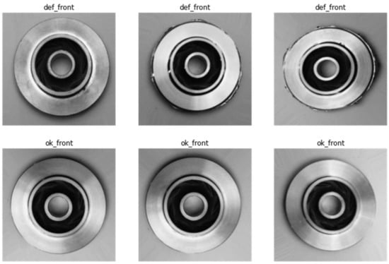 The dataset used in this paper is from Pilot Technocast, an SME that manufactures casting products in Gujarat, India. The data has been made available publicly by Ravirajsinh Dabhi []. The data consists of 7348 top-view images of submersible pump impellers. The products are made with stainless steel in a shell molding casting process. The images are captured under stable lighting using a Canon EOS 1300D camera kit produced by Canon Inc. located in Tokyo, Japan. Each image is converted to a size of 300 300 pixels. The data is pre-labeled into two classes: ‘def_front’ and ‘ok_front’, meaning defective and acceptable, respectively. A sample of six images that show three defective three acceptable castings are shown in Figure 4.