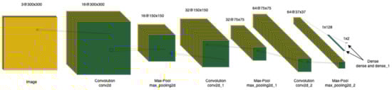 The AI model chosen for the inspection task is a CNN with a custom architecture. The network is constructed using a set of Convolutional Layers (Conv2D), Max Pooling Layers (MaxPooling2D), Activation Functions, and Dense Layers. The convolution operation performed by the Conv2D layer is a dot product of the ‘kernel’ and the image. The MaxPooling2D layer creates a pooled feature map by reducing the parameters involved. The max pooling layer consists of a technique called zero-padding that involves adding zeros to the edges of the image before the next convolution operation. This preserves any features that are generated at the edges of the images. In the proposed model, we use a kernel of size 3 3 for the convolutional layer and zero-padding in the max pooling layer. For the dense layer, we use the Rectified Linear Unit (ReLU) activation function []. Equation (1) shows the ReLU function where x is the input to the neuron.
